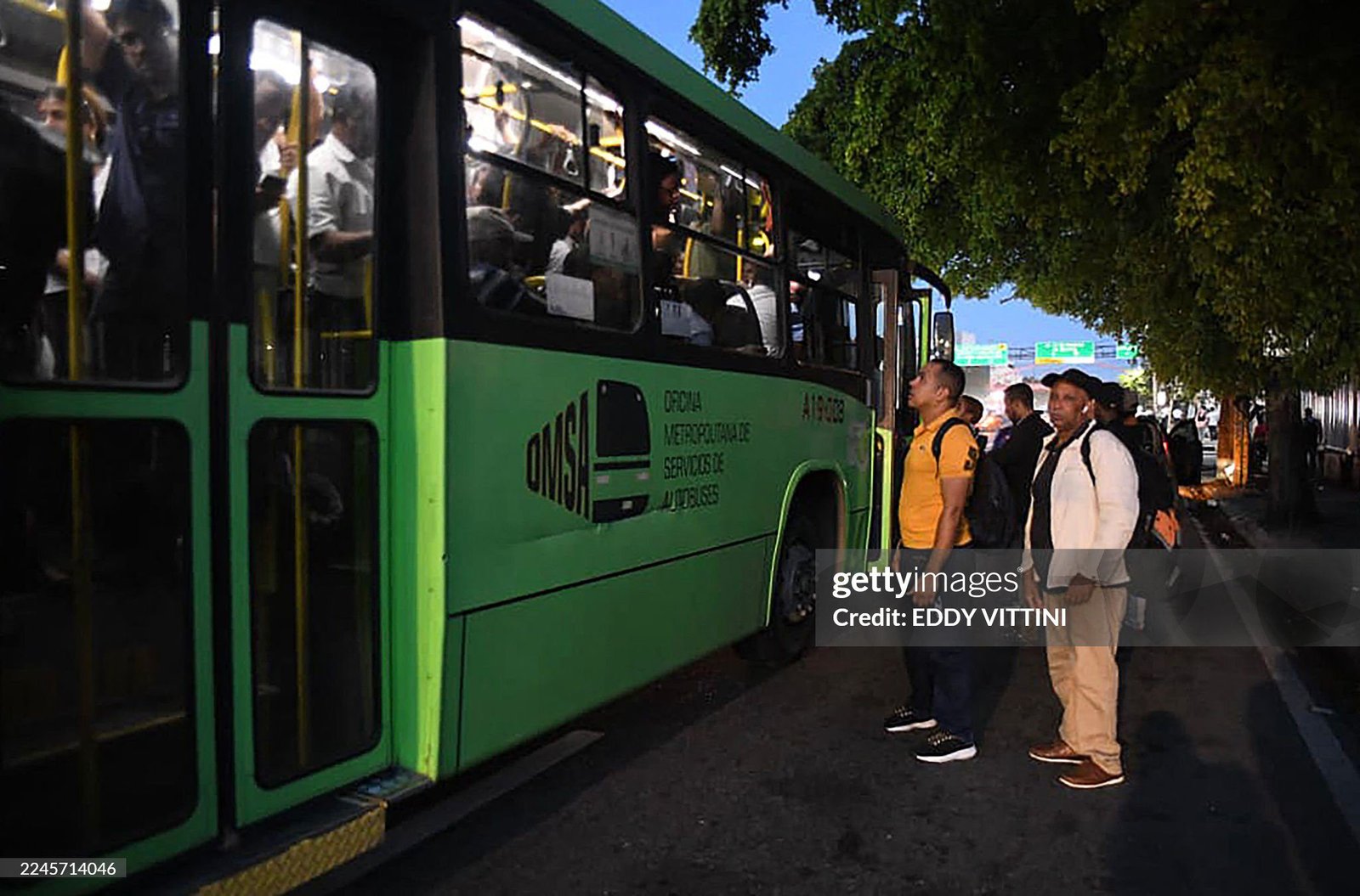 Passengers wait to board an overcrowded bus during a nationwide blackout in the Dominican Republic, causing major transportation disruptions.