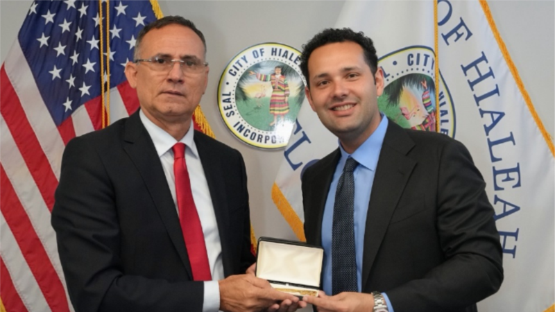 “Gracias al alcalde de Hialeah Bryan Calvo por el honor que me concedió. Me siento muy honrado y agradecido con este prometedor político comprometido con su ciudad y con la libertad de Cuba”, dijo Ferrer. “Este joven y brillante amigo llegará muy lejos sirviendo al pueblo en esta gran nación”.