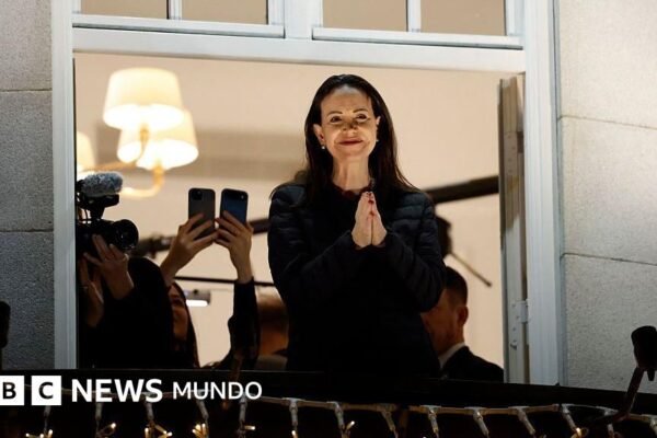 Fuente de la imagen, Getty Images Pie de foto, María Corina Machado saluda a sus seguidores desde un balcón en…