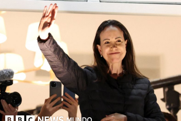 Fuente de la imagen, Reuters Pie de foto, María Corina Machado saluda a la multitud que la esperaba en Oslo….