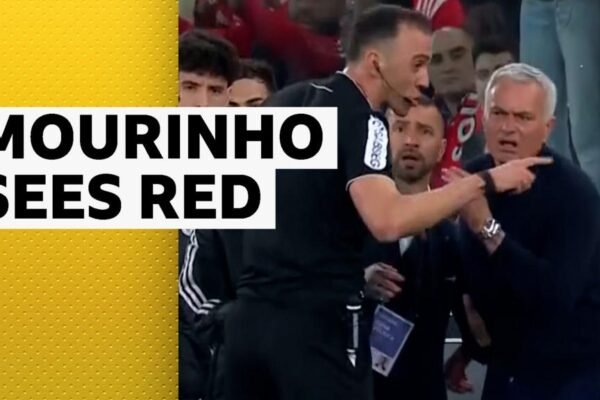 Benfica manager Jose Mourinho is shown a red card following an altercation between the benches after his side score a…