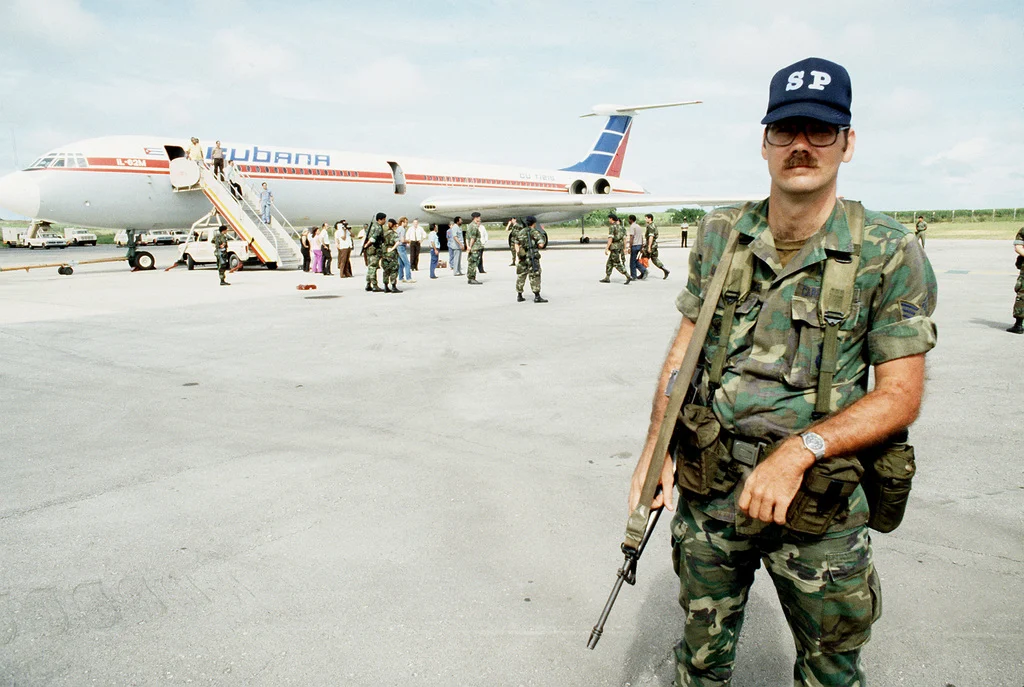 Featured Image: American soldiers stand in front of a Cuba-bound Cubana plane. The plane was carrying Cuban POWs captured by American forces during Operation Urgent Fury, the U.S. Invasion of Grenada